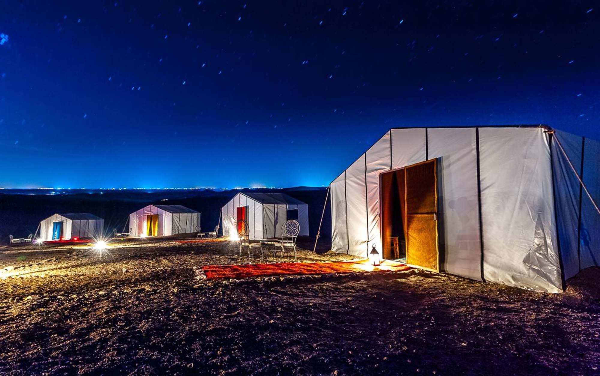 Noche mágica en campamento tradicional bajo cielo estrellado Sahara