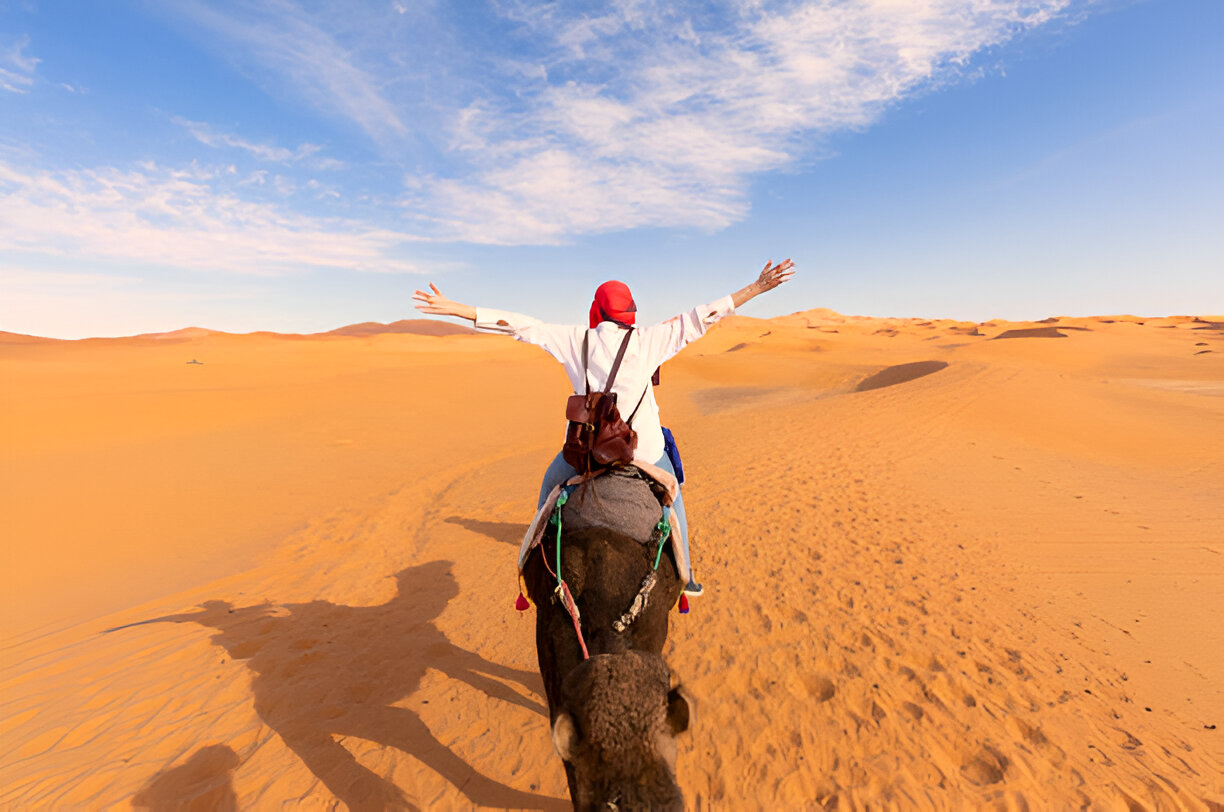 Por la tarde, llegamos al desierto de Merzouga, donde se realiza un paseo en camello cruzando las dunas de arena. Disfrutarás del atardecer sobre las dunas, un momento mágico. Después, nos dirigimos al campamento de lujo en el Sahara, donde podrás disfrutar de una cena tradicional marroquí y música bereber junto a la hoguera, bajo un cielo estrellado espectacular. Noche en el campamento.